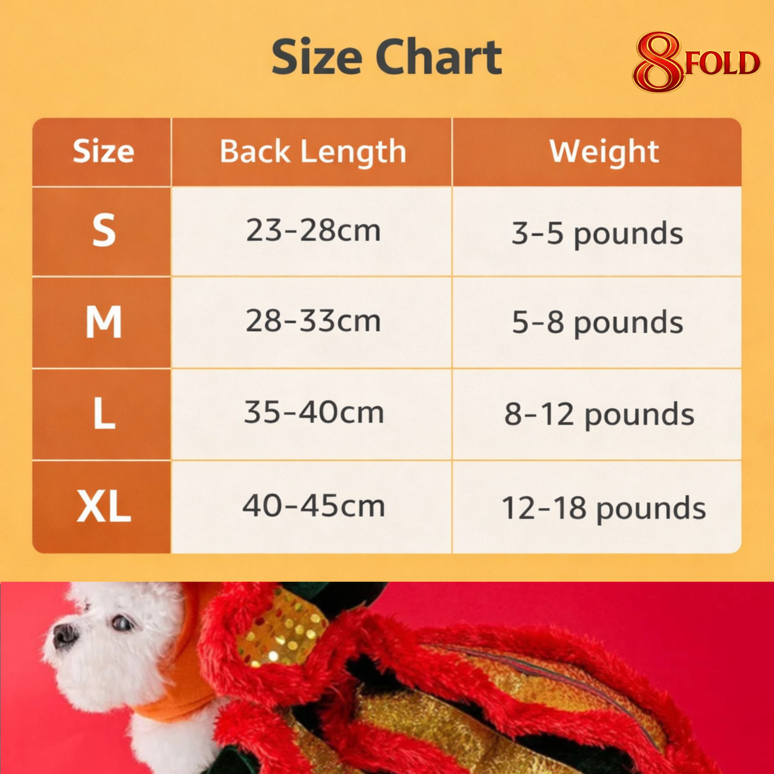 - XL (back length 40-45cm, recommended 12-18 pounds)